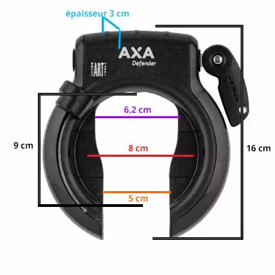 L’antivol de cadre Axa Defender peut être utilisé en combinaison avec la chaîne RL 100 afin de vous assurer une protection renforcée du vélo. L’antivol de cadre bloque la roue arrière, empêchant ainsi l’utilisation directe du vélo lors d’un vol. Pour le verrouiller, un simple tour de clé suffit. Cette clé est non amovible. L’antivol de cadre vient se fixer sur les haubans du vélo au niveau des trous filetés. Si votre vélo n’en est pas équipé, nous proposons des colliers de fixation pour antivol de cadre.