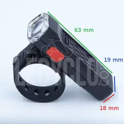 Ce phare avant se fixe sur le guidon via un collier en caoutchouc ajustable de 25.4 à 31.8 mm de diamètre. Il fonctionne avec une batterie 3.7V 80 mAh et se recharge par USB via un ordinateur, une prise secteur ou une batterie USB externe.