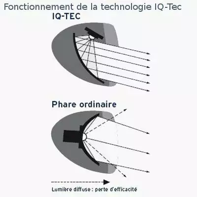 Technologie IQ-TEC Premium : la technologie IQ-Tec Premium permet d’avoir une plus grande intensité lumineuse sur le champ proche ainsi qu’un champs lumineux deux fois plus large.