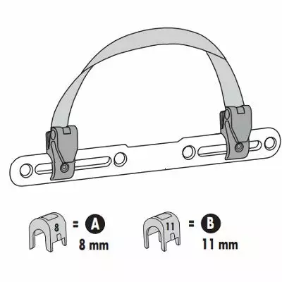 Le set de fixation Quick Lock 1 comprend la poignée avec les crochets supérieurs et un jeu de 4 réducteurs. Les crochets permettent de fixer les sacoches Ortlieb sur les porte bagages ayant un tube de 16 mm de diamètre max et peuvent s’écarter de 53 à 149 mm. Pour les tubes de porte bagages ayant un diamètre inférieur, vous avez 2 réducteurs de 11 mm et 2 de 8 mm.