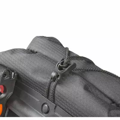 Cette double sacoche bikepacking est équipée du système de fixation QMR 2.0 qui s’adapte à une grande gamme de porte-bagages arrière. Pour être compatible, il faut que le diamètre du tube du porte-bagages soit compris entre 8 mm et 16 mm afin de pouvoir y fixer cette sacoche arrière. La plaque à l’arrière de la sacoche avec le crochet en bas (photo 5) lui permet de se fixer stablement au porte-bagages et ainsi éviter tout mouvement et secousse désagréable pour le cycliste lors de passages sur des chemins plus accidentés. Les crochets permettent d’attacher et de détacher facilement la sacoche, avec une seule main.