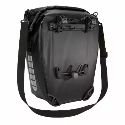 La double sacoche Shield Pannier 25L Thule dispose d’une fixation pratique sur porte-bagages vélo arrière. Les sacoches bénéficient chacune de 3 crochets à l’arrière. Les 2 crochets supérieurs viennent fixer la sacoche au porte-bagages tandis que le 3ème, qui se situe en bas, permet à la sacoche de ne pas bouger lorsque vous roulez. Une plaque en PVC sur laquelle sont positionnés les crochets vient rigidifier l’ensemble de la sacoche pour une attache encore plus sûre. Les 2 crochets supérieurs s’adaptent aux porte-bagages ayant des tubes d’un diamètre compris entre 8 et 16 mm sans utiliser d’adaptateurs.