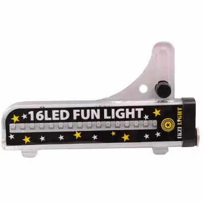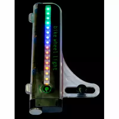 Cet éclairage de roue de vélo permet de rendre visible le cycliste vis-à-vis des autres usagers de la route. La lumière comprend au total 16 LED de 4 couleurs différentes, et est fournie avec 3 piles AAA R03. Cette lumière originale s’installe facilement sur les rayons du vélo par système de clips. Poids de 120 grammes environ – dimensions 150 x 90 mm.