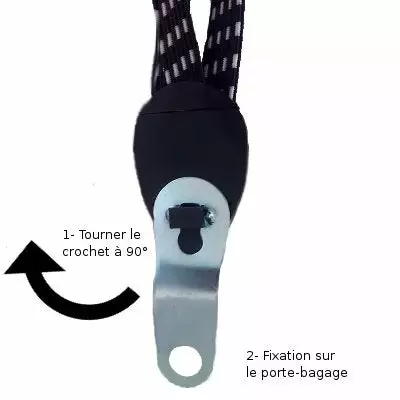 Sa fixation est simple : il faut dans un premier temps tourner les crochets à 90 degrés pour l’extraire de l’élastique, puis fixer les crochets directement sur le porte bagage. Disposez vos affaires sur ce dernier, et raccordez l’élastique aux crochets.