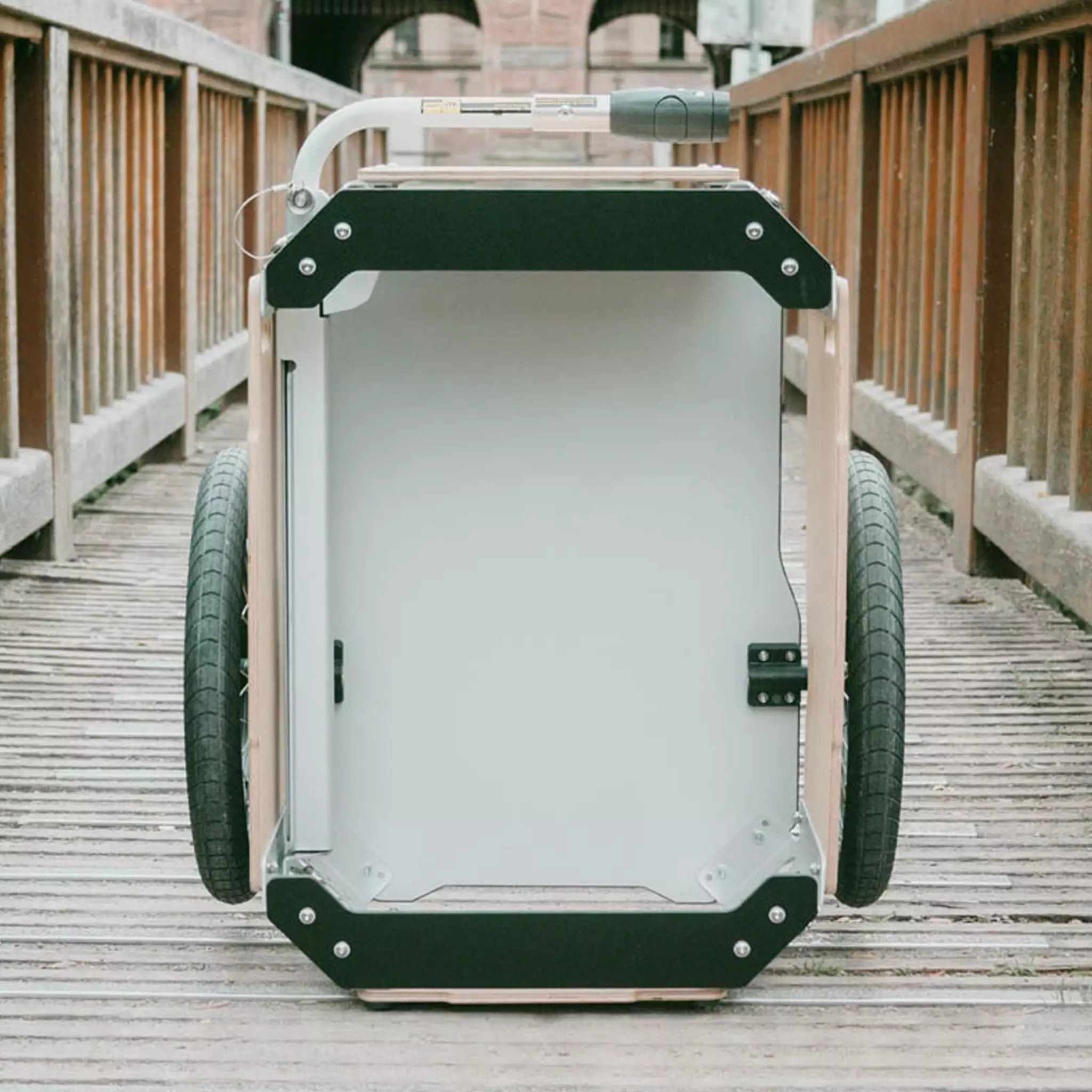 La remorque Aperta est la plus légère des remorques Carette. À ciel ouvert, elle se compose uniquement de la structure en bois vernis de 70 L et des amortisseurs intégrés. Vous pouvez la charger autant que vous le souhaitez jusqu’à 40 kilos. La Aperta ne demande que peu de maintenance et s’entretient très facilement. Les roues 16 pouces robustes Hinterher sont tout chemin, et les pneus 2.00 pouces sont assez larges pour assurer une bonne tenue sur rues pavées, chemins cahoteux et terrains sablonneux. La Aperta est ainsi parfaitement adaptée pour les déménagements à vélo, et autres transports de marchandise. Elle offre un roulage silencieux et stable, passe les portes et les ascenseurs et peut même monter quelques marches. La béquille réglable intégrée permet de maintenir la remorque à l’horizontal lors du chargement et du déchargement.