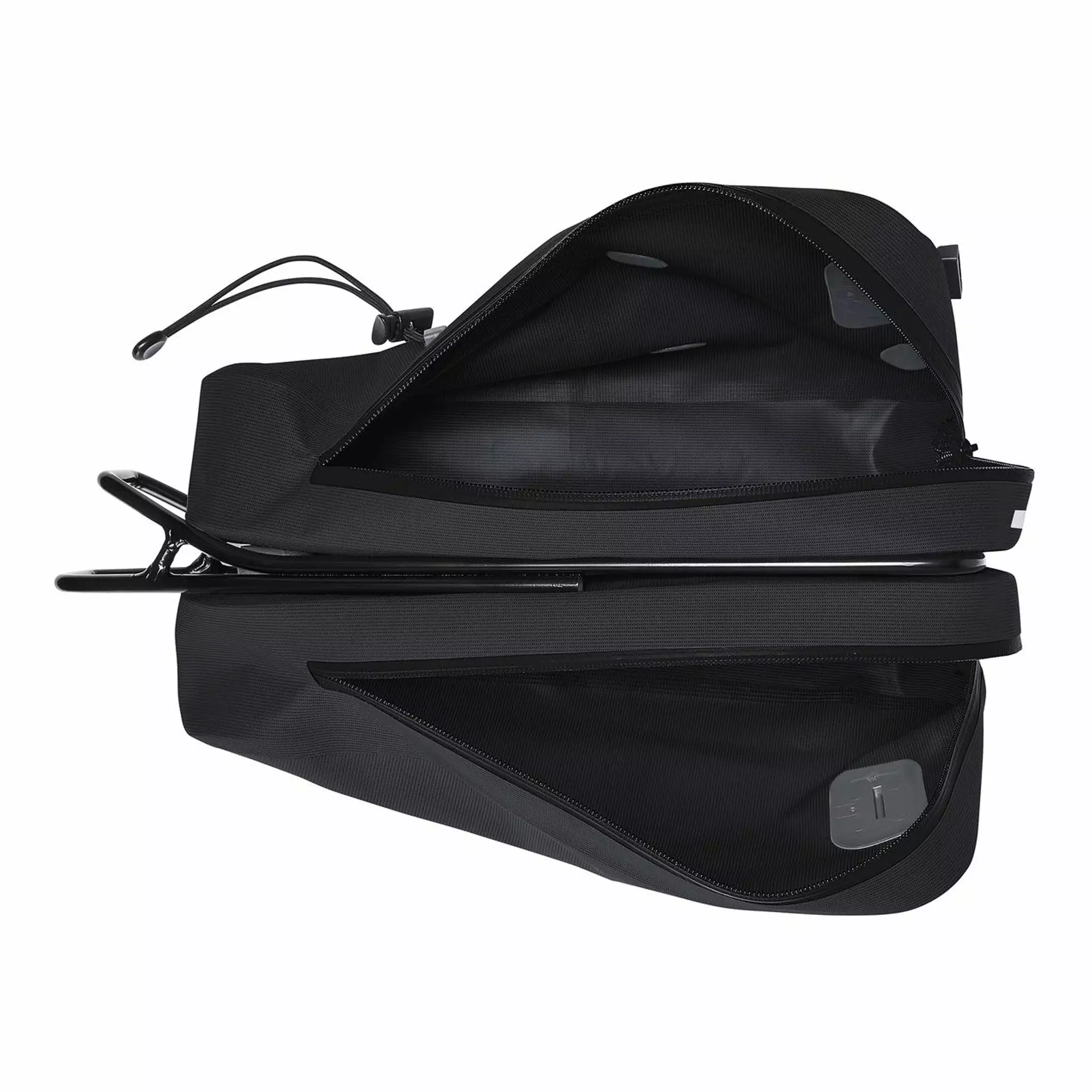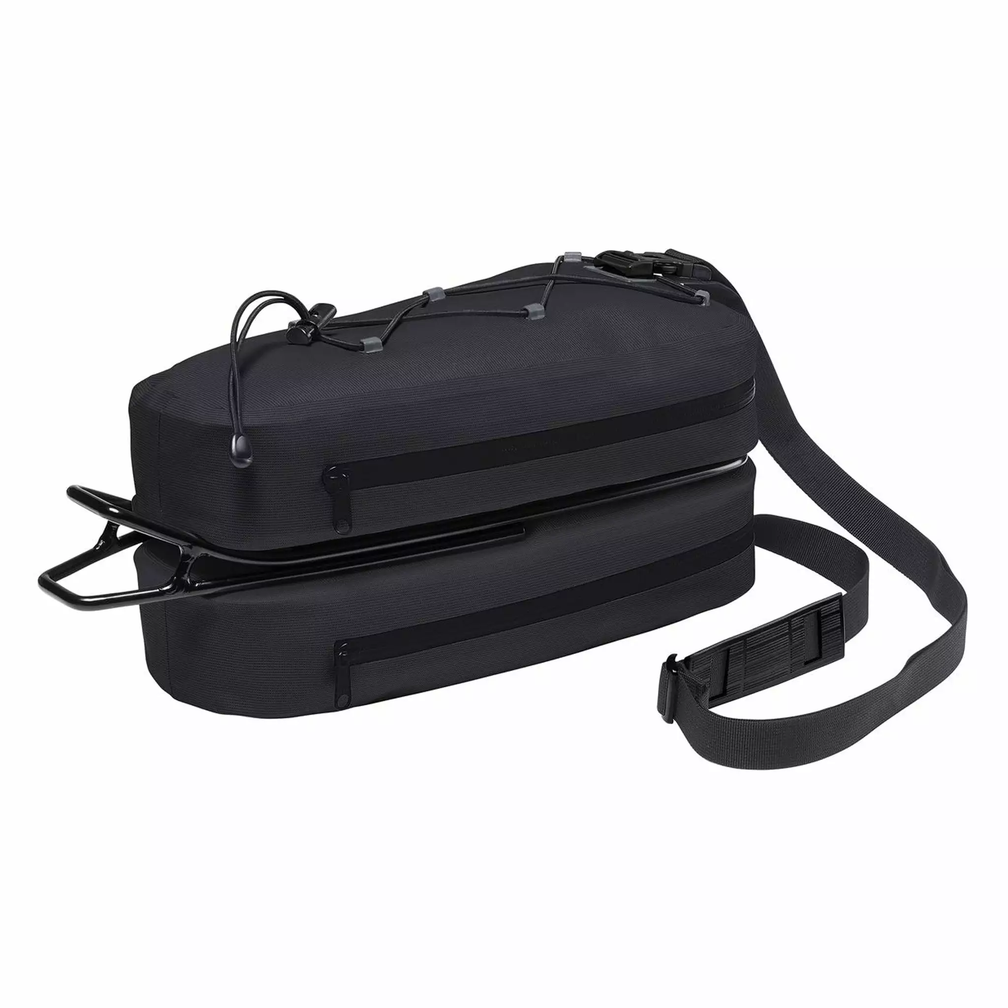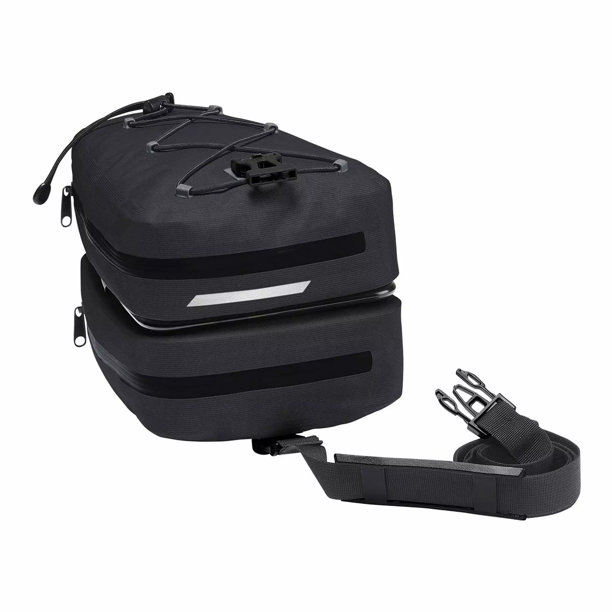 Le premier atout de la sacoche est sa construction en deux sacs séparés avec l’adaptateur Klickfix Contour intégré. Chaque compartiment se superpose et offre une grande ouverture pour un accès facile aux affaires. La séparation en deux sacs superposés permet un rangement optimal. Vous pouvez, par exemple, ranger les outils multi fonctions plus lourds en dessous et votre matériel de bivouac ou vêtements de pluie dans le compartiment supérieur. Ce dernier se complète d’un cordon extérieur pour y attacher une cape de pluie, des gants ou autres. Une bandoulière permet de porter la sacoche à l’épaule.