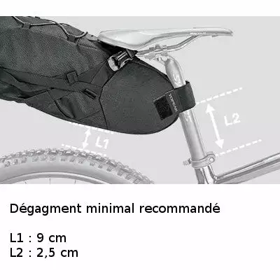Cette sacoche bikepacking est en deux parties : un sac externe résistant à l’abrasion et à la pluie qui contient un sac étanche interne muni d’une valve pour en faciliter la compression. Le chargement maximal de ce sac arrière est de 5 kg pour 15 L. Le sac externe est pourvu d’une attache pour un phare rouge et d’un filet élastique pour garder une veste de vélo à portée de main.