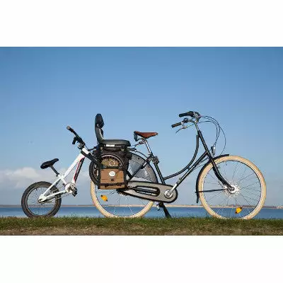 Avec la sacoche Bakkie, il est possible d’utiliser son vélo pour tracter un second vélo adulte ou un vélo enfant à partir de 16 pouces. La sacoche Bakkie n’est toutefois pas conçue pour tracter un vélo avec un occupant. Si vous voulez également installer un siège pour enfant sur le porte-bagages, il pourrait être utile de dégager de l’espace pour les jambes de l’enfant en fixant le sac Bakkie sur un prolongateur de porte-bagages. Il sera alors aussi possible de sangler une draisienne sur la Bakkie.