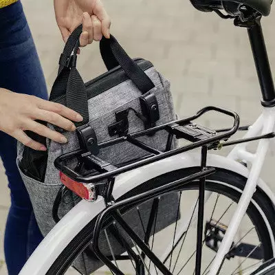 La sacoche vélo se détache très simplement du porte-bagages afin de l’emporter partout avec vous pour vos excursions. Une fois détachée du vélo, vous pouvez transporter votre sacoche à la main soit à la main à l’aide des deux anses présentes au-dessus, soit à l’épaule grâce à la bandoulière fournie.