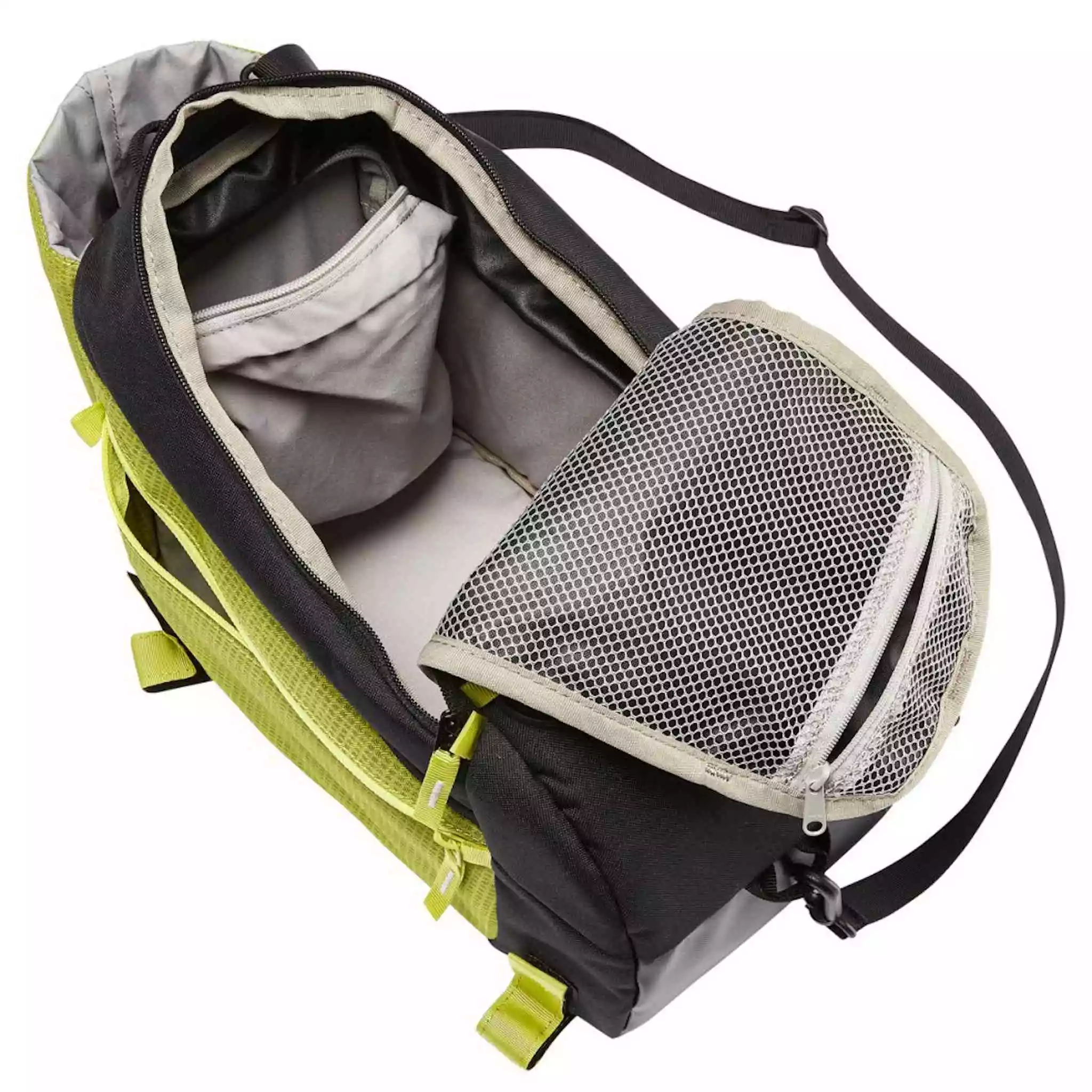 Elle présente un volume global de 9 litres mais est également extensible de 2 litres pour arriver à un total de 11 litres de rangement. La poche principale est extensible vers le haut à l’aide d’un zip et d’un soufflet.