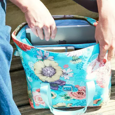 Pour les sorties urbaines à vélo, Basil a développé son joli sac cabas Shopper bleu ciel avec motifs floraux à installer sur le porte-bagages arrière de la bicyclette. Spécialement conçu pour les cyclistes du quotidien, adeptes de vélotaf ou qui ont pour habitude de faire leurs courses à vélo, le Shopper Bloom offre de nombreux avantages : une parfaite étanchéité, un rangement intérieur pour un PC portable, de longues lanières en nylon pour le porter à l’épaule et un système d’attache rapide et solide au porte-bagages. L’intérieur de la sacoche se ferme par un zip noir caoutchouté. Ensuite, la fermeture par enroulement permet également de gérer le volume de la sacoche qui va de 15 à 20 litres.