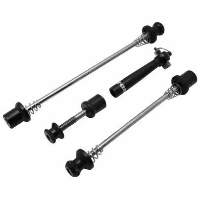 Les axes à serrage rapide sécurisés sont solides et conformes au standard du cycle afin d’être compatibles avec la majorité des axes à serrage rapide pour roues et selle de vélo. L’axe pour la roue avant mesure 110 mm de long, l’axe pour la roue arrière 145 mm et l’axe pour le collier de selle mesure 27 mm de long.
